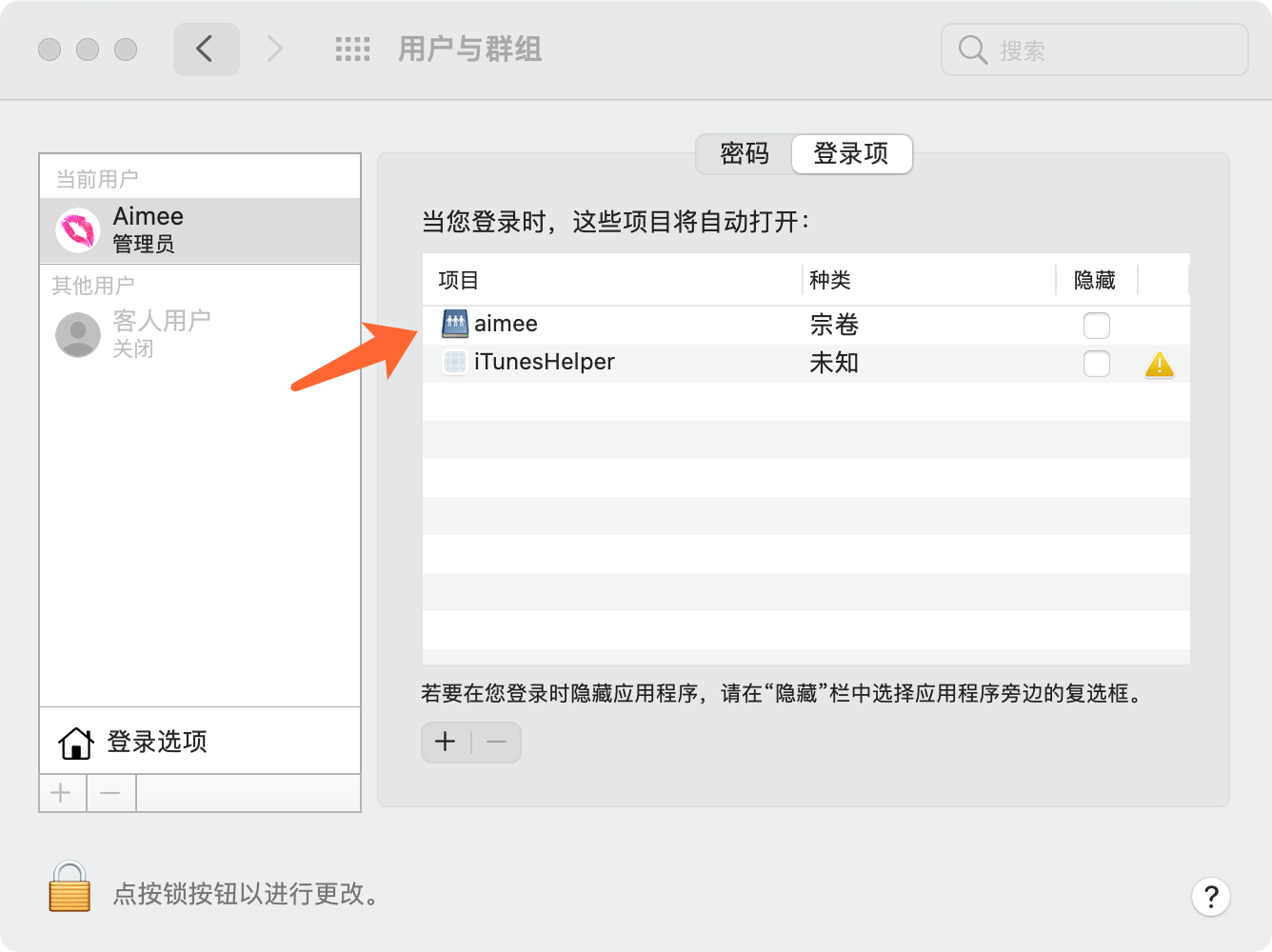 - 然后点击你的管理员头像 > 登录项,如果列表里面没有你添加的服务器,那么,点击下方的 + 号